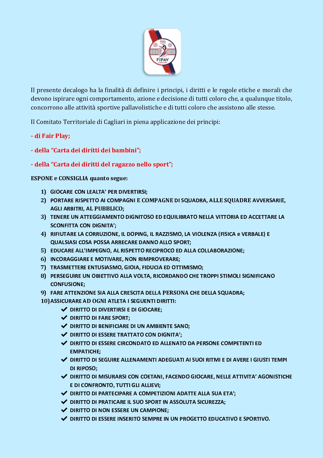 Con l’avvio dei campionati di categoria e divisioni del Comitato Territoriale di Cagliari la stagione sportiva sta entrando nel vivo. Tutti noi, atleti, tecnici e dirigenti, siamo chiamati a dare il meglio di noi stessi nei rispettivi terreni sportivi, per cercare di ottenere il massimo risultato agonistico, come è nell’essenza stessa di ogni disciplina sportiva. A questo proposito il Comitato Territoriale di Cagliari, nell’augurare il conseguimento dei traguardi più ambiti, vuole rivolgere un appello a tutte le parti attive della federazione affinchè in ogni ambito ci sia un comportamento consono all’immagine di fair play e sportività che la FIPAV vuole dare al proprio interno e a tutto il mondo sportivo. Fair play significa rispetto delle regole e dell’avversario, avere spirito sportivo, il modo giusto di vivere l’attività, sia essa ludica che a tutti i livelli. Per questo il Comitato Territoriale di Cagliari chiede a tutti di tenere un comportamento esemplare, che costituisca un modello positivo per tutti coloro che si avvicinano al nostro sport; evitando atteggiamenti sleali, provocatori, o peggio, lesivi dell’etica sportiva e personale, dentro e fuori i campi di gara. Conoscendo le grandi qualità umane dell’intero mondo della pallavolo il Comitato Territoriale di Cagliari ha predisposto un decalogo da diffondere e utilizzare per promuovere comportamenti positivi nell’ambito di tutte le competizioni sportive che ci apprestiamo a vivere insieme.